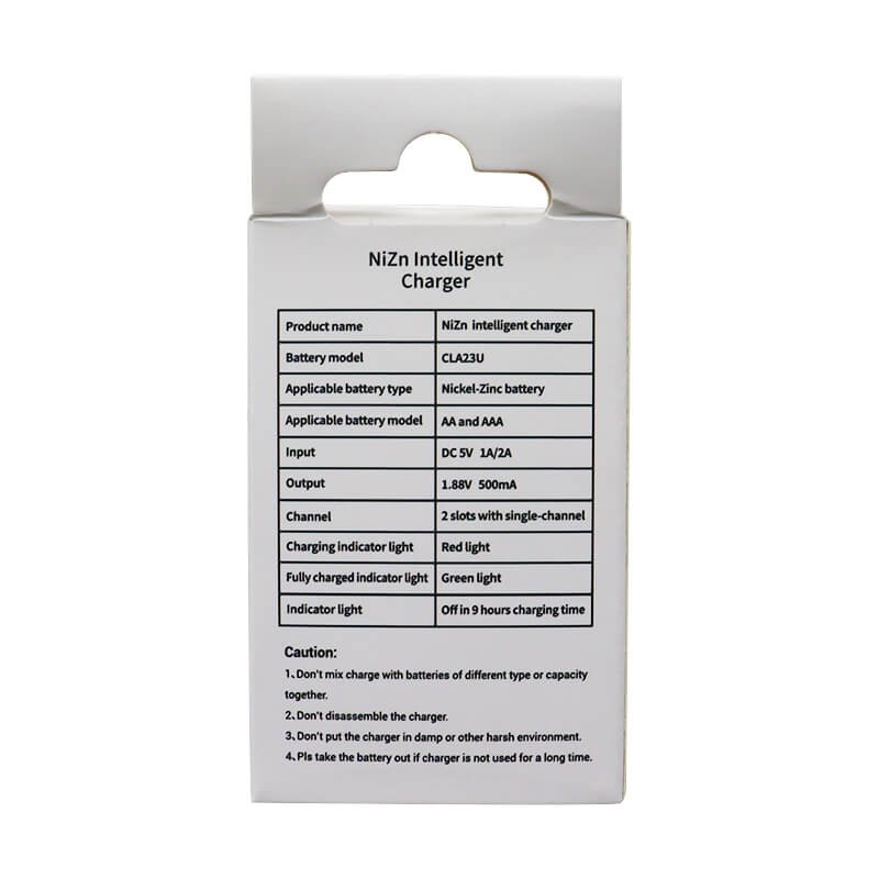 The zinc-nickel battery charger is only suitable for charging zinc-nickel batteries. Model CLA23U adopts 2-way 2-slot independent chip charging control, which can realize single and mixed charging of AA or AAA NiZn cells. The charger also has functions such as low-voltage battery repair, anti-reverse charging, constant voltage protection and timing protection.